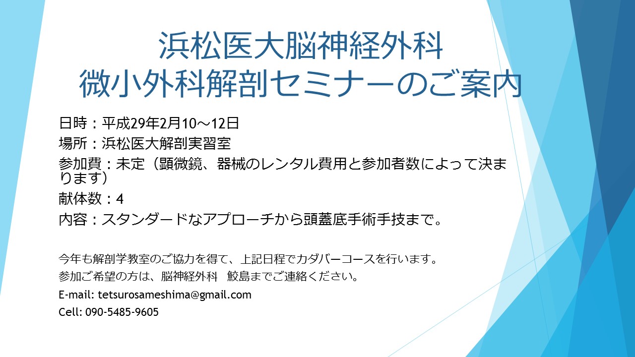 2月10~12日の3日間、浜松医科大学解剖実習室にてカダバーコースを開催しました。若手主体のコースですが、スタンダードな手術アプローチから頭蓋底手技まで、内容は幅広くてとても充実していたと思います。これからも定期的に行っていきたいと思います。