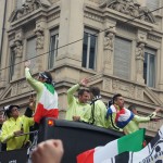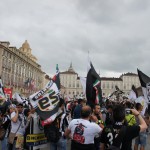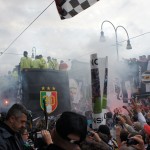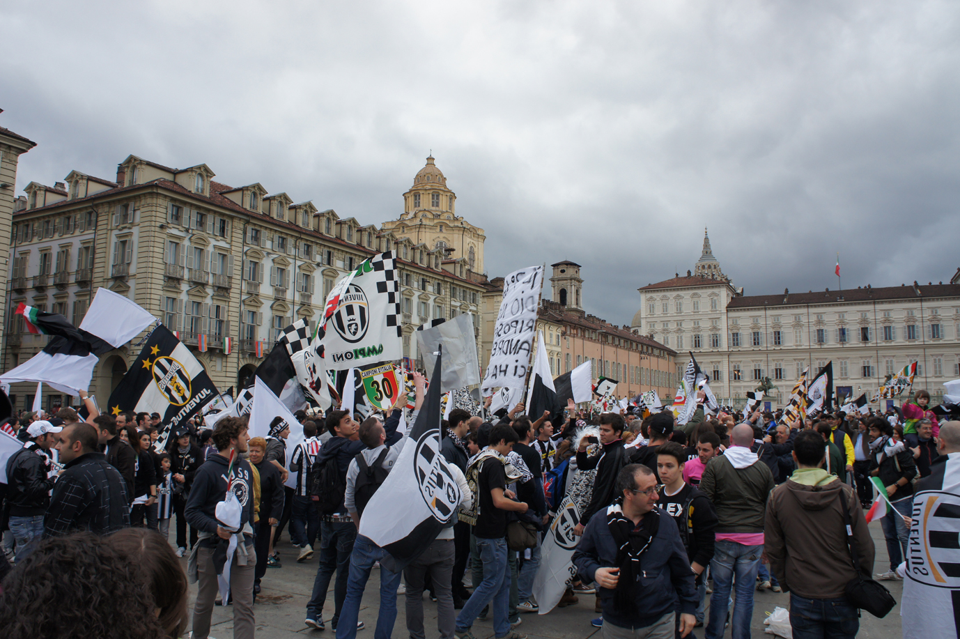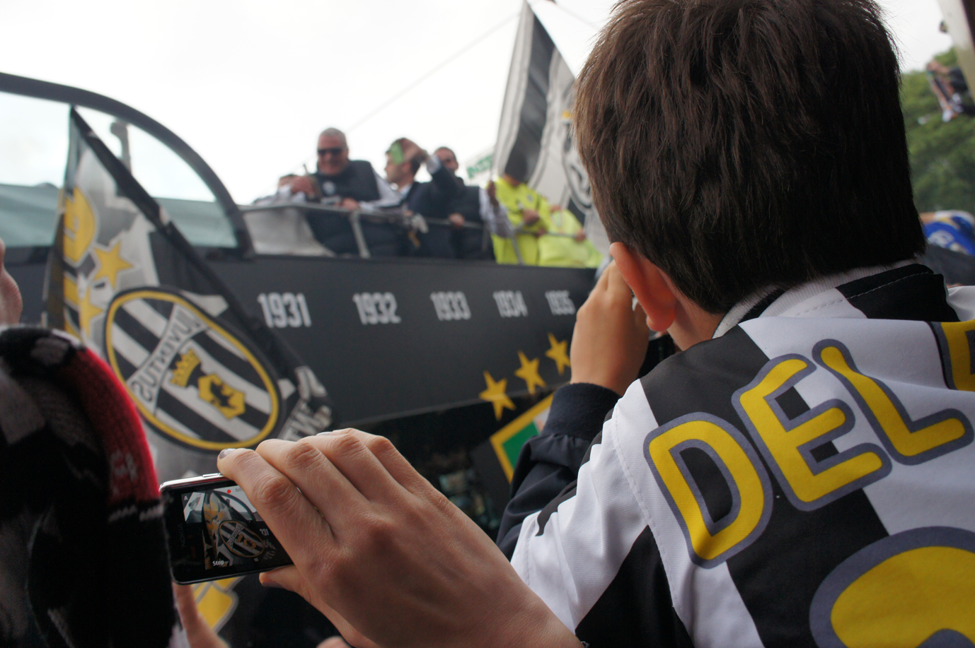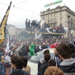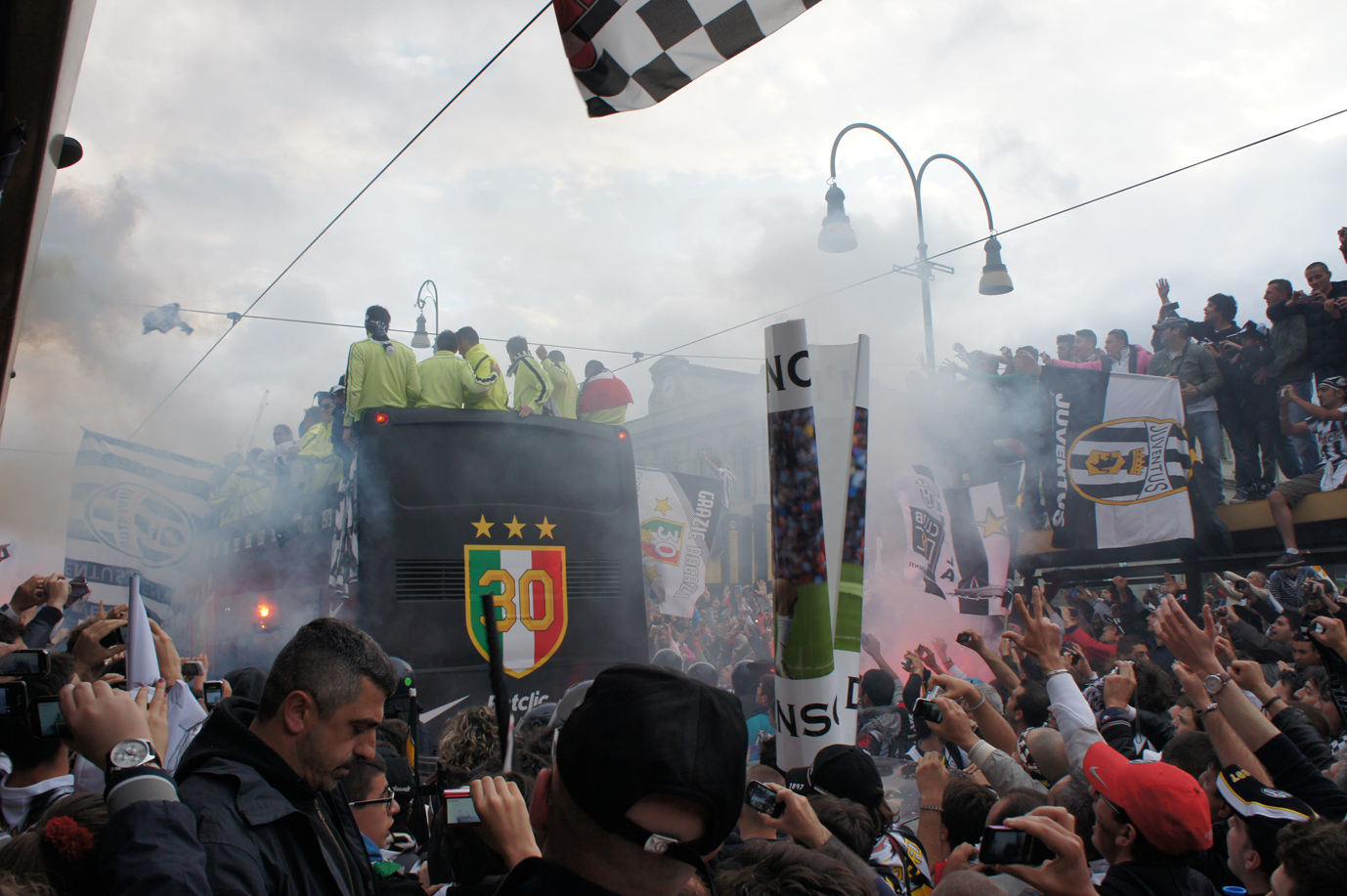 ユベントスの優勝パレードです。まるで暴動が起きたかのような大騒ぎです。これがデルピエロにとって最後の試合になるかもしれませんが、足の状態がとても良くない中で凄いシュートを決めてくれました。後半途中交代すると多くのサポーターが号泣していました。 — 場所: トリノ