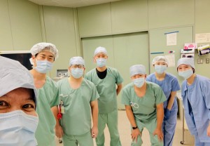 浜松医大時代の後輩で同じ考え方で支えてくれた菊山先生が手術見学に来てくれました。 「久しぶりにまともな開頭手術を見ました」と喜んでもらえて私もすごく嬉しかったです。 我々の強力なスタッフと一緒にスナップ写真。